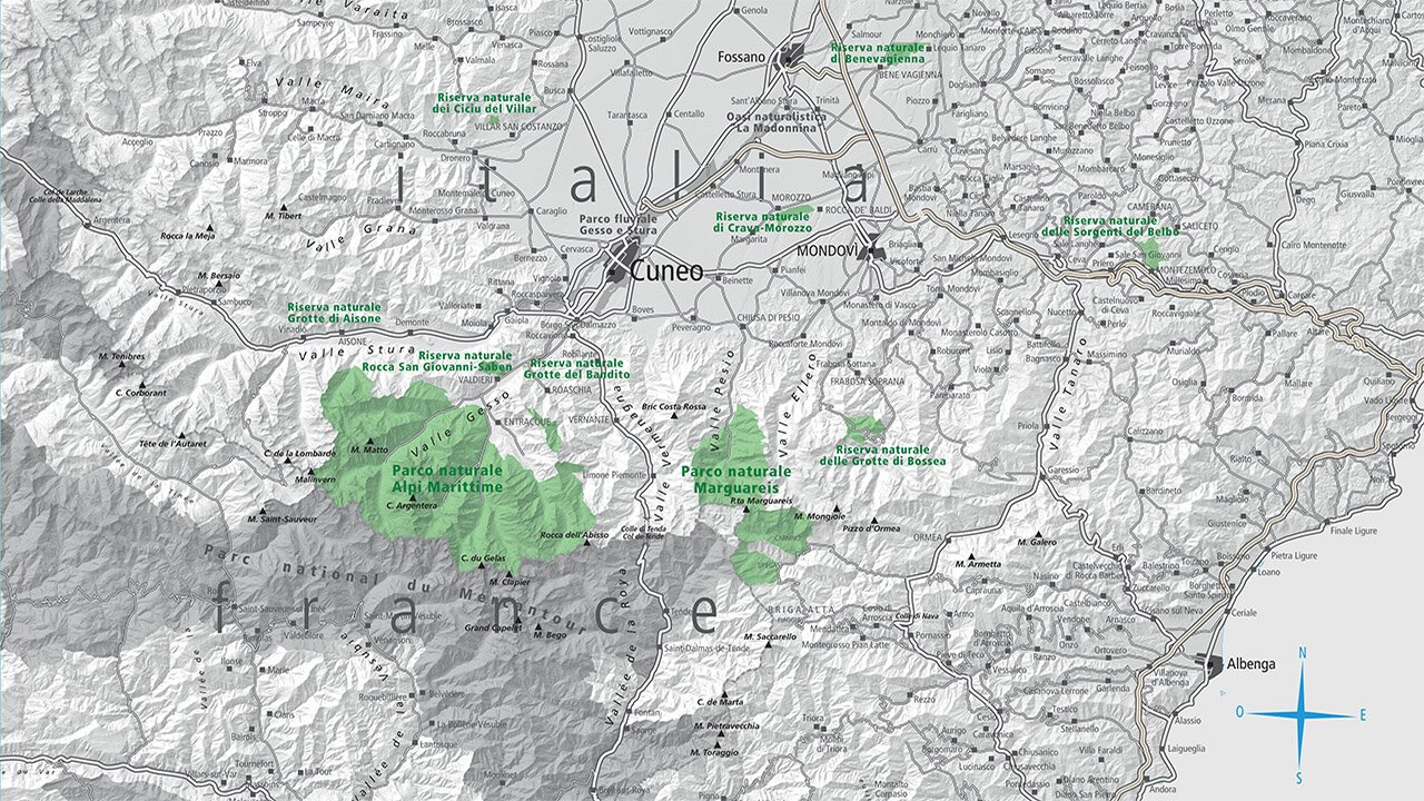 Alte cime, grandi pareti e valli profonde: è un territorio severo e spettacolare quello del Parco delle Alpi Marittime. Il suo scheletro di gneiss e granito serpeggia attraverso le valli Vermenagna, Gesso e Stura. È un rincorrersi di vette rocciose che per ben 24 volte superano i 3000 metri. Ai loro piedi si annidano piccoli ghiacciai e centinaia di laghi.La superficie del Parco è di 28.360 ettari e si ripartisce su cinque comuni (Aisone, Entracque, Roaschia, Valdieri, Vernante) confinando per oltre 35 chilometri con il Parc National du Mercantour. Una lunga cresta che si affaccia sul Mediterraneo distante appena 40 km. Posizione geografica, morfologia e vicende geologiche sono gli elementi principali di una straordinaria biodiversità. La ricchezza floristico-vegetazionale, con i suoi numerosi endemismi tra i quali la famosissima sassifraga dell’Argentera (Sassifra florulenta), è il fiore all’occhiello delle Alpi Marittime.